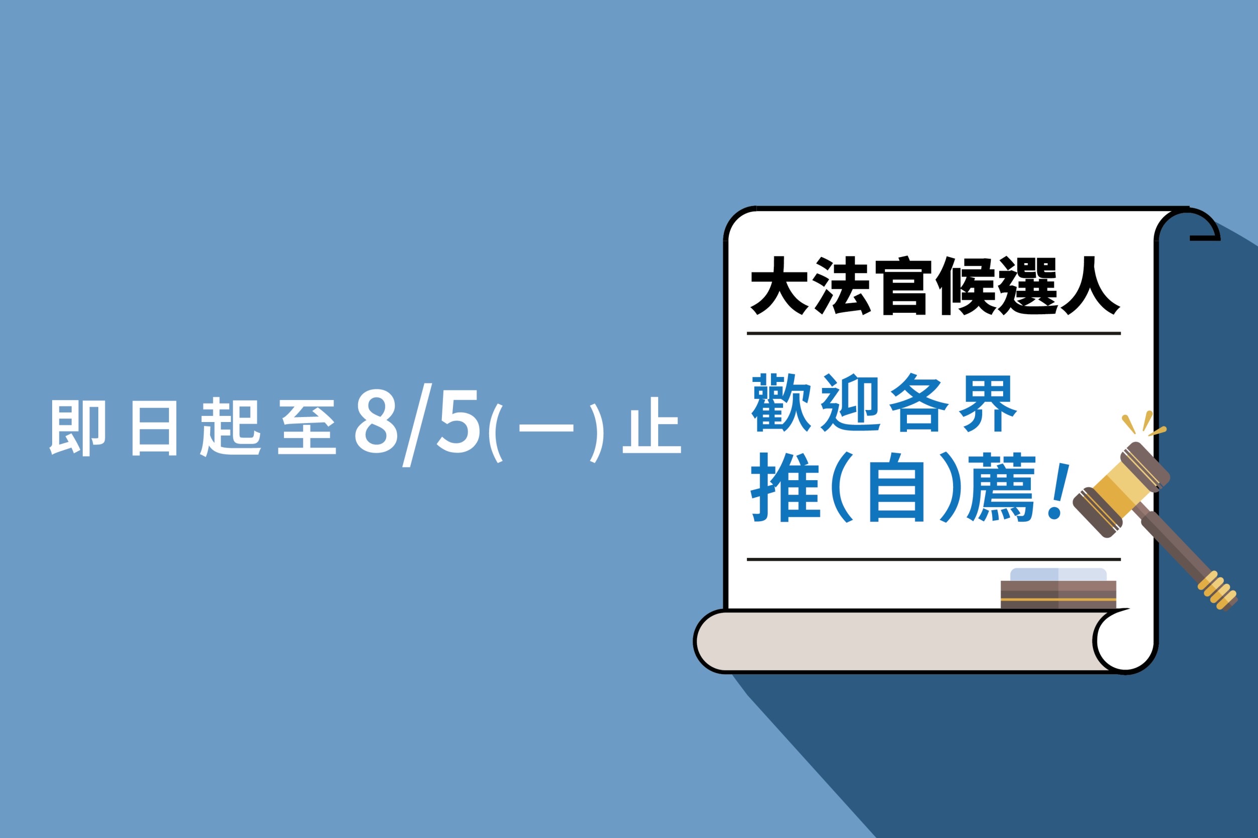 受理各界推(自)薦期間將於8月5日截止,審薦小組特別呼籲社會各界踴躍推薦或自我推薦,後續將秉持公正、客觀立場,傾聽各方意見,襄助總統提名專業、適任的大法官人選。