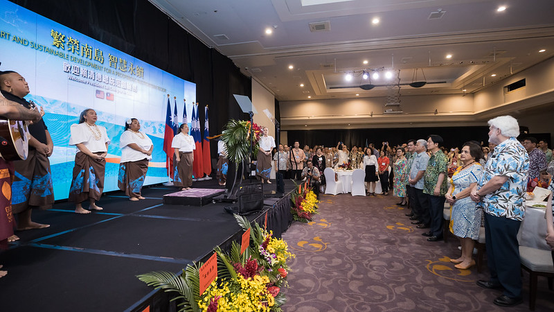 總統抵達會場後,首先欣賞關島文化團體唱誦原住民族查莫洛(Chamorro)祈福曲。隨後致詞時表示,這是他第一次來到關島,感謝古蕾露(Lourdes A. Leon Guerrero)總督伉儷及在座的美國貴賓來到現場,展現對臺灣的支持。