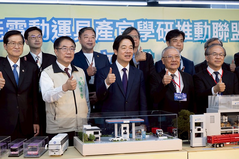 隨後,總統與現場貴賓一同進行啟動儀式,並參觀「電動車晶片模組暨充電樁研發製造人才培育基地」,及進行「氫能電動運具產官學研推動聯盟」成立儀式。